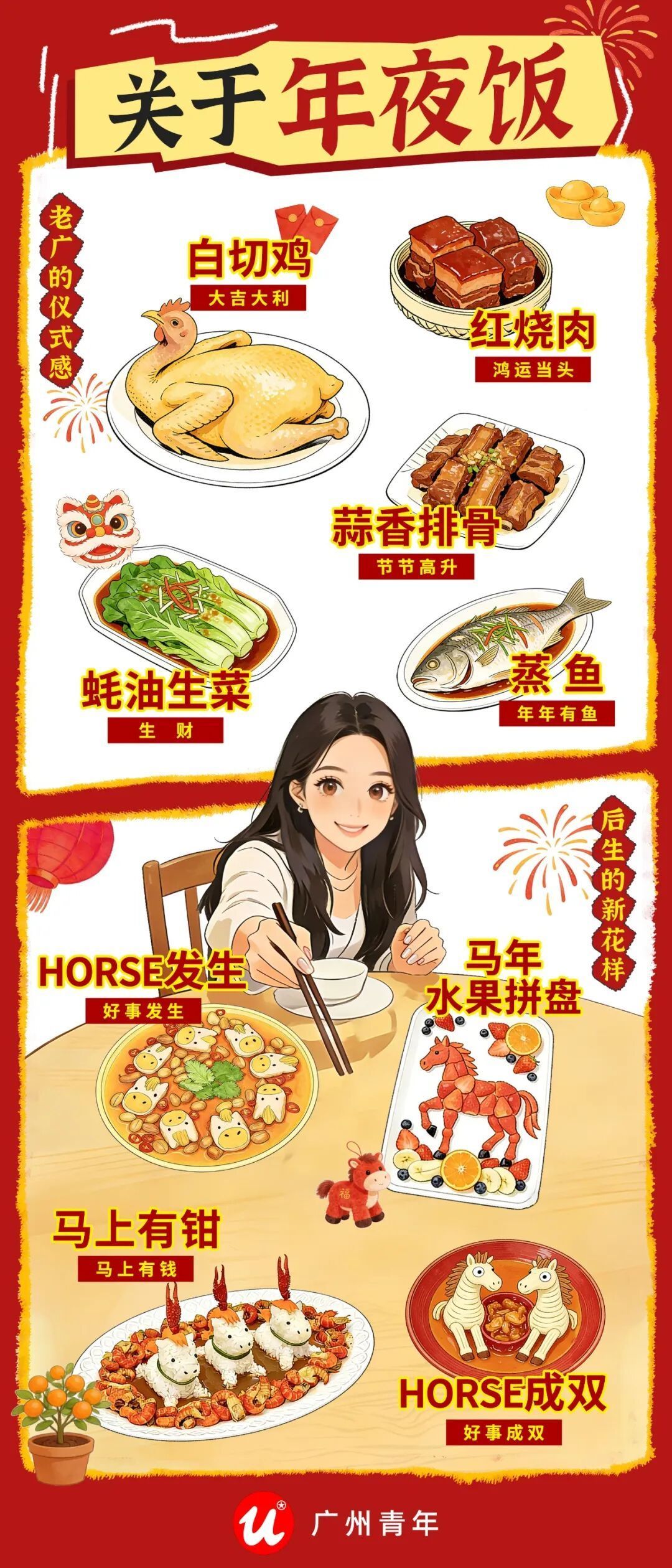 年轻人的创意菜式,把“马上有钳”端上桌,用水果拼出“马年”的形状,好事就要“HORSE成双”。“好意头”,被玩出了新花样。
